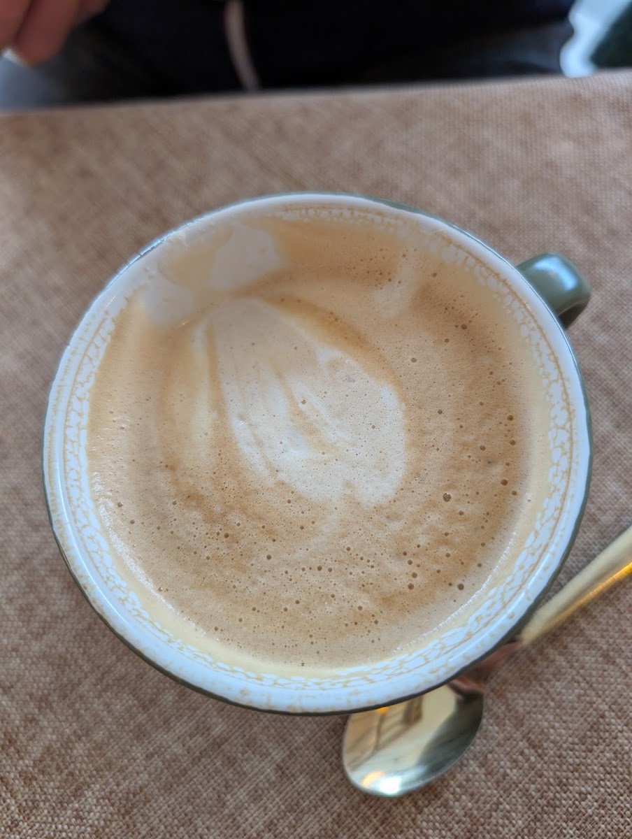 A lovely small cafe but very cosy and welcoming. Great service and reasonable. I had the sausage sandwich which was delicious and was tempted to have another one! Easy access from the street outside, no steps to negotiate. Will definitely be back. Thank you